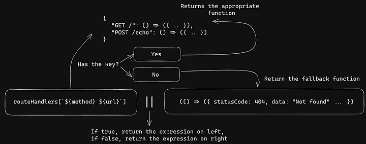 We're looking for a key in the routeHandlers object, which matches the incoming method and URL. If the key is available, we're going to use the value of that key from routeHandlers, which is in-fact a function. If the key is not found, means that we do not have a handler associated for a particular method and URL combination, we simply assign the handler variable with the value of a function that returns:
