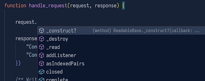 you would've got the autocompletes when you tried to access any property or method of request or response object. This might look okay, but it's always better to have reusability in mind. To fix this, let's just use jsdoc styled comments:
